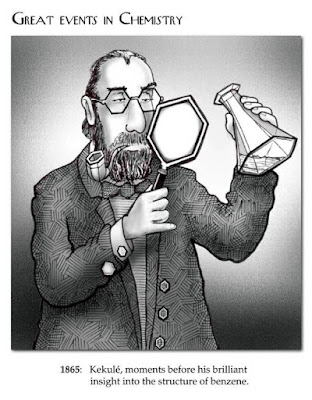Kekule je poslije pričao kako je sanjao zmiju koja grize svoj rep, drevni simbol beskonačnosti, poznat kao ouroboros. Međutim, tu su sliku iz njegovog sna izložili satiri: šaljivi prikaz benzena pojavio se 1886. u Berichte der Durstigen Chemischen Gesellschaft, parodiji na Berichte der Deutschen Chemischen Gesellschaft, samo što su parodiji majmuni hvatali jedan drugog za rep u krug, umjesto zmije.